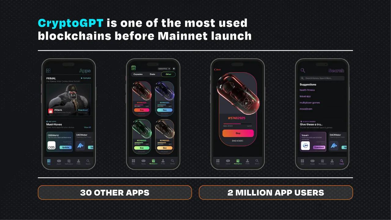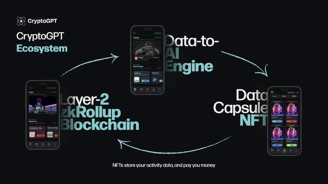 CryptoGPT는 기존의 게임, 피트니스, 교육, 여행 등 다양한 애플리케이션을 개발했거나 개발 중인 팀들을 하나의 코어 앱으로 온보딩시켜서, 이 다양한 앱을 이용하는 Web3 사용자들의 데이터를 수집하여 AI 기업에 판매하고 해당 수입을 토큰 홀더들과 셰어링하는 것을 BM으로 가지고 있습니다.