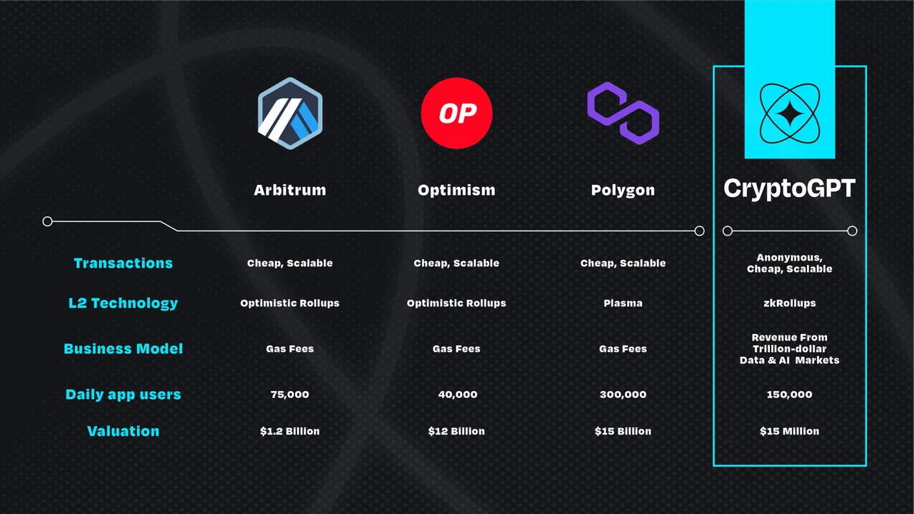 CryptoGPT는 올해 4분기 중에 zkRollup 기반의 AI 전용 레이어2 블록체인을 출시하는 것을 목표로 하고 있습니다. 팀에서는 DAU나 트랜잭션의 측면에서 이미 크게 성장한 아비트럼이나 옵티미즘, 폴리곤에 비해 약 1,000분의 1에 해당하는 1,500만 달러 수준으로 밸류에이션을 하고 있네요.