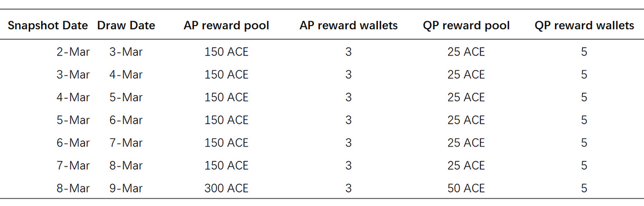- 이벤트 기간 둘째 날부터 AP 보유자 중 랜덤으로 3명을 선정하여 150 ACE를 균등하게 지급하고, QP 보유자 중에서는 5명을 선정하여 25개의 ACE를 균등하게 지급합니다