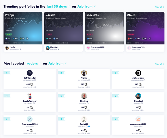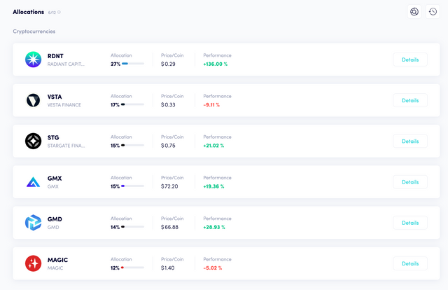 아니면 위 링크를 클릭해서 GMX, RDNT, VSTA, STG, GMD, MAGIC 등 주요 아비트럼 프로젝트 토큰들로 구성된 포트폴리오에 투자할 수도 있습니다.