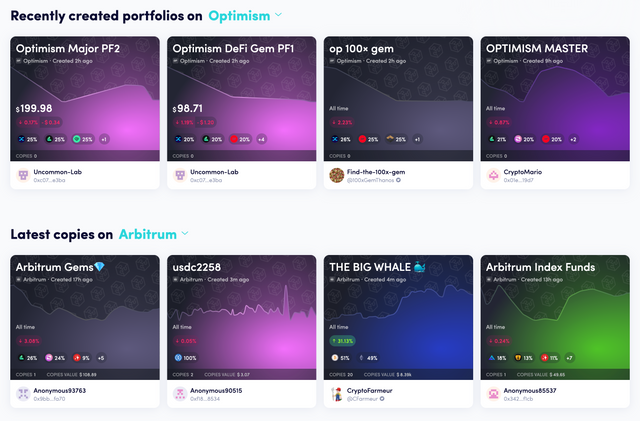 한 포트폴리오당 최대 12개의 토큰으로 구성이 가능하며, 최초에 포트폴리오를 구성한 소유자는 언제든 자신의 포트폴리오를 자신의 전략에 따라 조정할 수 있습니다. 그리고 다른 사용자들은 자신이 팔로우하고 있는 좋은 리서처나 트레이더가 어떤 포트폴리오를 구성하고 있는지 확인하고, 그 전략을 카피하여 투자를 시작할 수 있습니다.