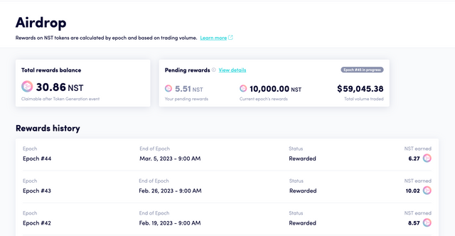 에어드랍을 통해 배분되는 NST는 총 2,625,000개이며 포트폴리오의 전체 가치, 카피된 포트폴리오의 횟수와 가치, 포트폴리오 생성/관리/복제/예치 등의 모든 활동에 따라 1시간 단위로 스냅샷이 찍히고, 자신의 비율에 따라 보상을 받게 됩니다.