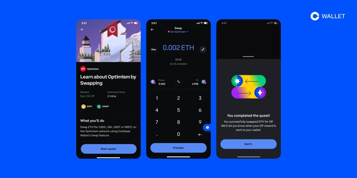 안녕하세요, 디온입니다. 코인베이스 월렛에서 옵티미즘과 함께 간단한 태스크를 수행하고 4개의 OP토큰을 받을 수 있는 Quests on Wallet 이벤트를 진행하고 있습니다.