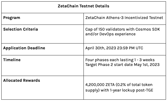 ZetaChain은 인센티브 테스트넷 프로그램에 토큰 총 공급량의 0.2%에 해당하는 4,200,000 ZETA를 할당하였습니다. 각 참여자별 개별 보상 금액은 특정 작업 완료 및 전체 밸리데이터 성능을 기반으로 최종 결정됩니다. 적격 참가자는 KYC를 완료해야 하며 ZetaChain의 이용약관이 적용됩니다.