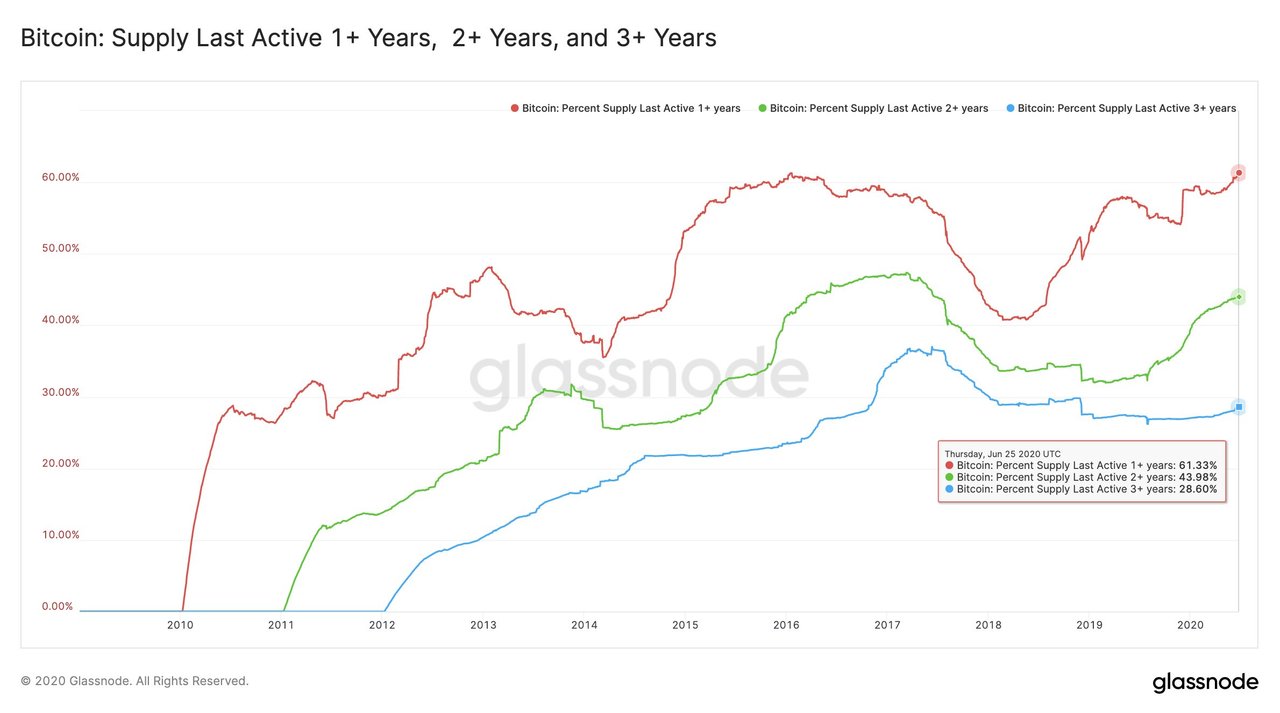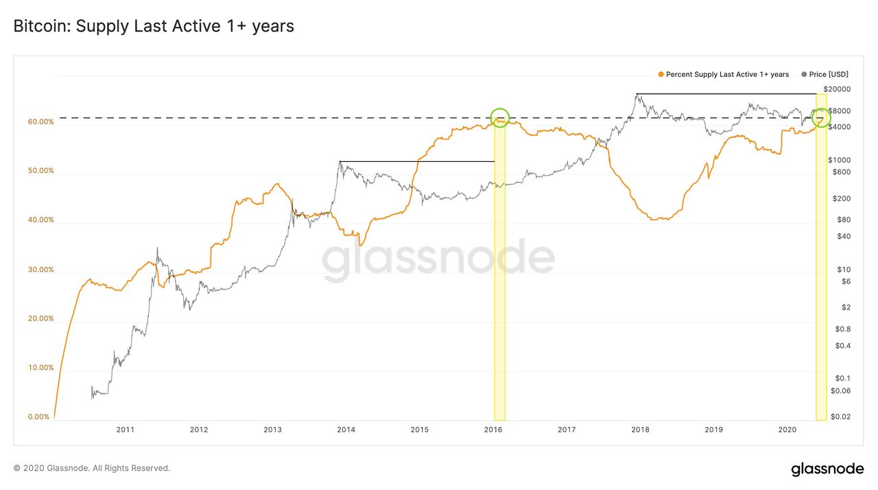 현재 61%의 비트코인이 1년 동안 아무런 움직임이 없는 상태이며 이는 2016년 초 이후 제일 높은 수치(ATH)에 해당합니다. 2016년에 해당 수치가 ATH를 찍었던 이후부터 본격적인 비트코인의 상승 랠리가 시작되었었기 때문에 많은 애널리스트들은 비트코인이 이제부터 20K까지 Bull Run할 가능성이 높다고 보고 있습니다.