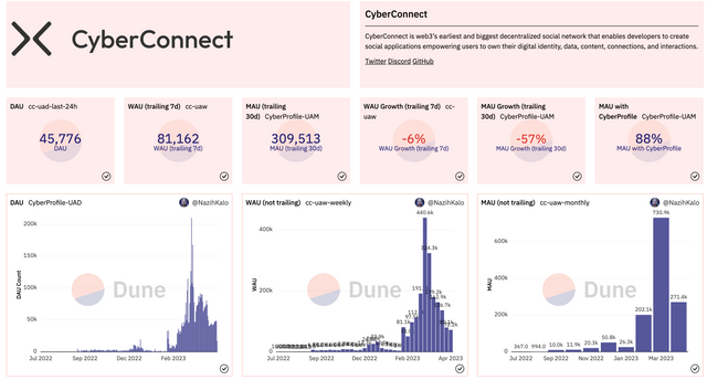 CyberConnect는 730만 건 이상의 거래를 수행한 887,000개의 CyberProfile과 327,000개의 활성 지갑을 보유하고 있으며 이더리움, BNB체인, 폴리곤을 비롯하여 지원하는 EVM호환 체인들을 계속해서 늘려나가고 있습니다.
