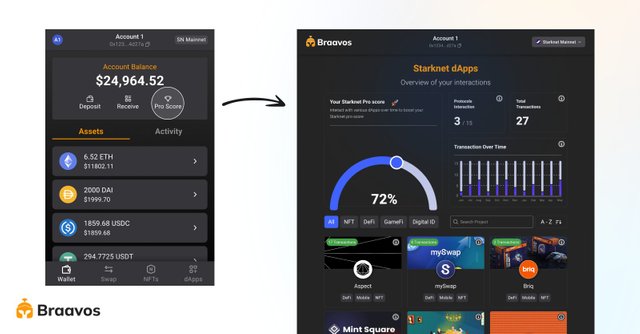 - 메인 화면에 Pro Score 버튼을 클릭하여 스타크넷 디앱들을 사용해보고 Starknet Pro score를 올릴 수 있습니다