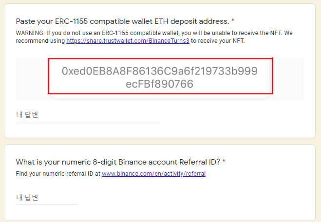 트러스트 월렛을 다운로드 받은 뒤에 ETH지갑 주소를 제출양식에 입력하면 끝!