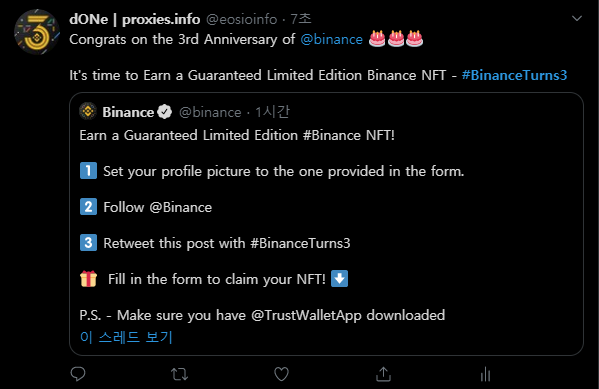 ③ 해시태그 #BinanceTurns3를 사용하여 활동 중인 소셜미디어에서 바이낸스의 포스팅을 리트윗하거나 공유