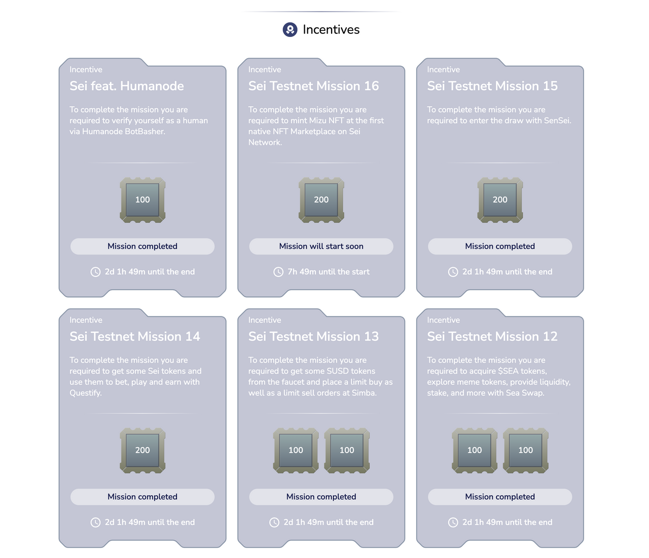 위 링크를 통해 Sei Testnet에 현재 어떤 미션들이 있고, 어떻게 해야되는지에 대해서 모두 확인해볼 수 있습니다. 일부 미션은 이미 종료가 되었고, 일부는 미션 시작 전인데 현재 수행가능한 미션도 많으니 꼭 참여를 해보시기 바랍니다.