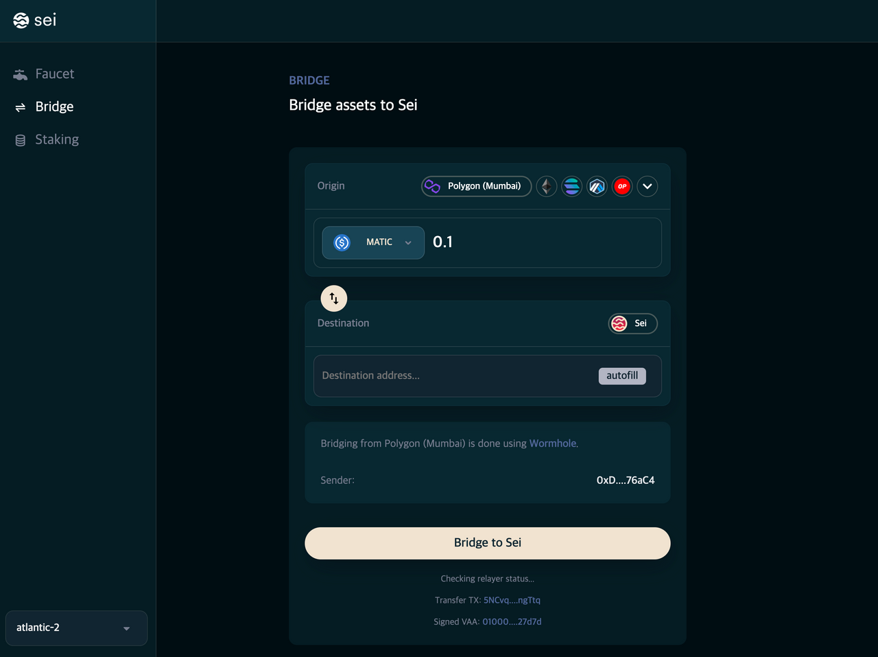 ➊ 위 링크를 통해 Polygon Mumbai 테스트넷 또는 Solana Devnet에서 웜홀 브릿지를 통해 MATIC 또는 SOL 토큰을 Sei Atlantic-2 테스트넷으로 옮기면 됩니다.