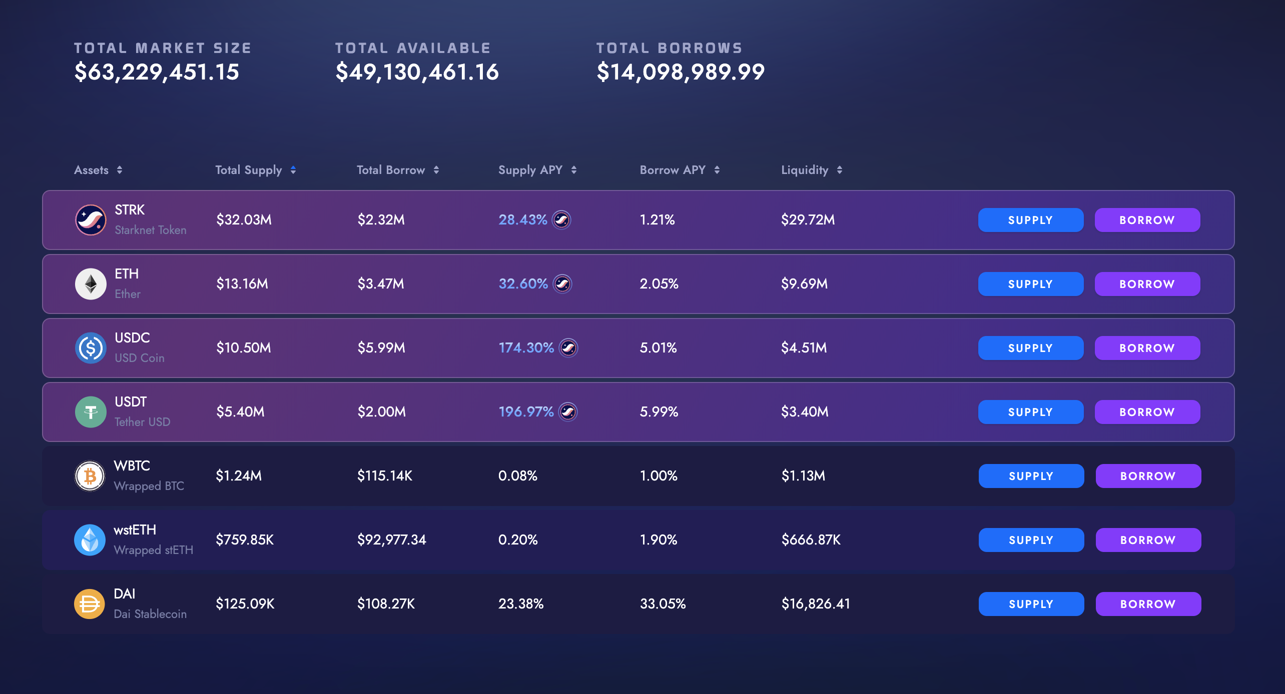 현재 머니마켓에서 스테이블코인의 유동성 공급 APY가 170~200% 사이로 굉장히 높은 편입니다. 사실 자체적인 APY(예를 들어 USDT를 제공하고 USDT로 이자를 받는 것)는 그다지 높지 않은 편이나 여기에 STRK 토큰이 추가 인센티브로 제공되는 관계로 현재 일드 파밍을 하고자 하는 유동성들이 계속해서 예치가 되어 있습니다.