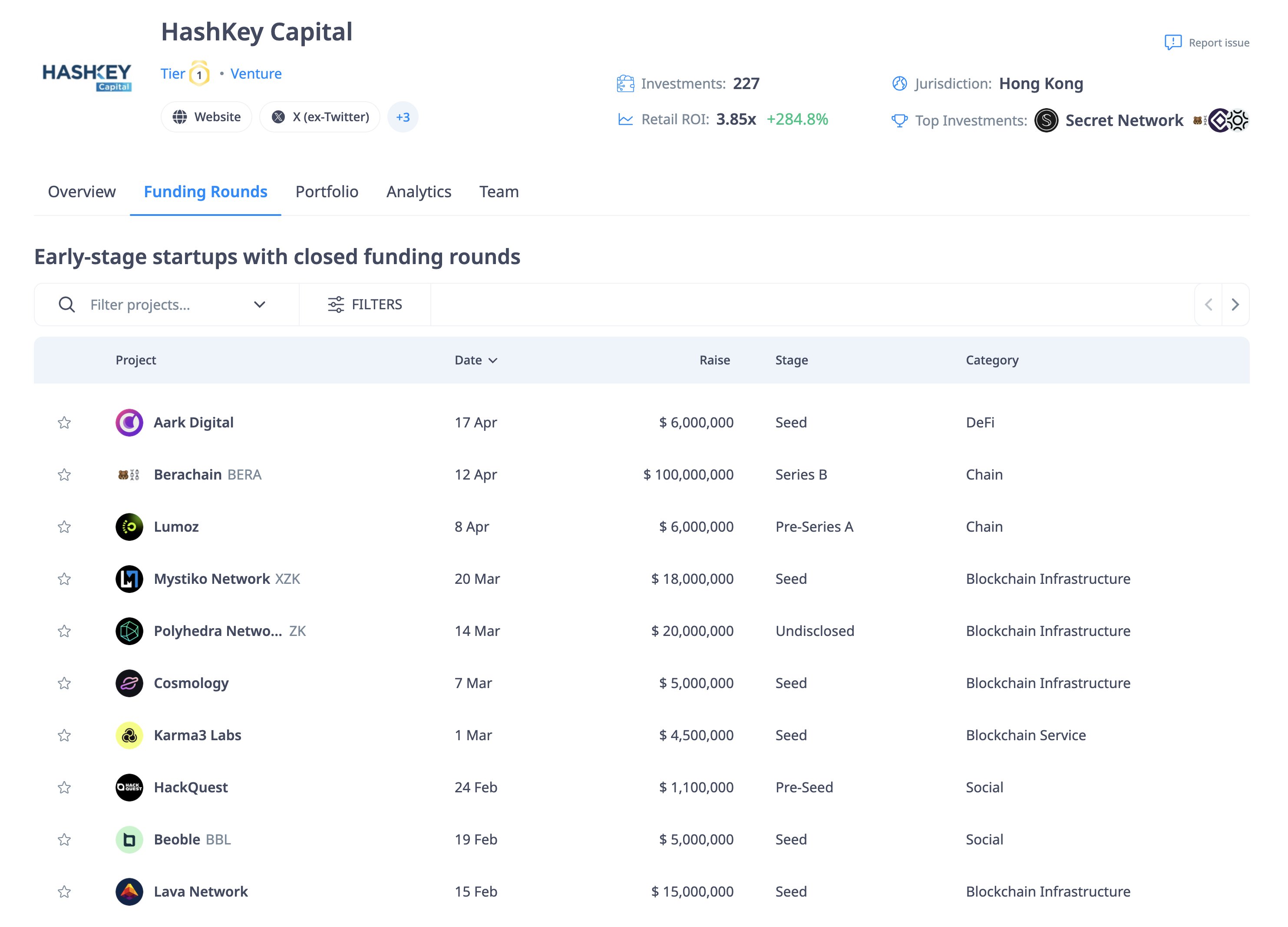 2015년에 설립된 해시키 캐피탈은 10억 달러 이상의 AUM을 운영하고 크립토 투자자라면 누구나 알법한 크립토 유니콘 기업 및 프로젝트에 꽤나 성공적인 투자를 진행한 바 있습니다. 해시키 캐피탈은 지난 2022년~2023년 베어마켓 속에서도 꾸준히 다양한 프로젝트들에 투자를 해오고 있고 그 수가 무수히 많습니다.