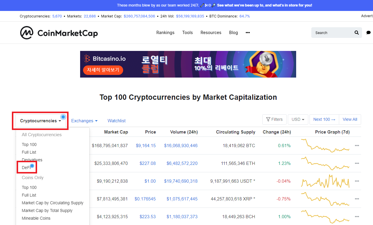 이제 코인마켓캡에서도 DeFi 관련 프로젝트 디지털자산들을 확인할 수 있는 별도의 탭이 신설되었습니다.