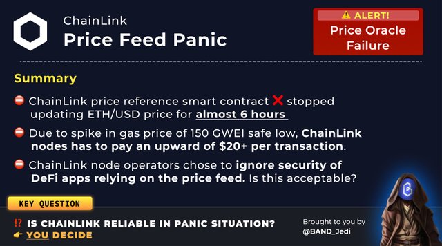 체인링크에서 제공하는 ETH/USD 가격 피드 업데이트가 약 6시간 가량 중단이 되면서, 체인링크 오라클 서비스에 의존하고 있던 DeFi들의 가격 업데이트도 중단이 되어 버렸습니다.