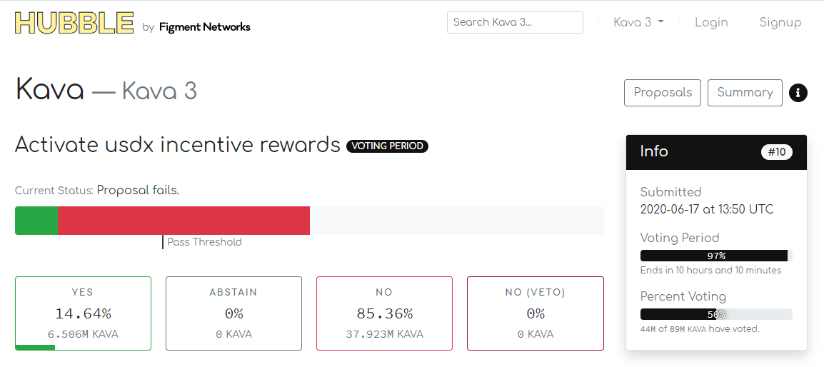 해당 프로포절은 BNB에 대한 USDX보상 활성화에 관한 프로포절로 일단 Kava팀에서는 "활성화 반대"에 투표하여 모든 상황을 전체 올스탑을 시켜놓은 상황입니다.