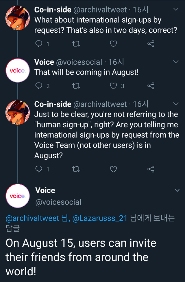 현재 트위터를 통해 공개된 내용에 따르면, 미국이 아닌 국가에 거주 중인 사용자들은 8월 15일부터 보이스에 가입하는 것이 가능할 것으로 예상이 됩니다. 혹시라도 아직 VOICE에 사전회원가입 신청을 해놓지 않으셨던 분들은 지금 미리 해 놓으시는 것도 괜찮을 것 같네요. 8월 15일 이후부터는 기존 VOICE 유저가 초대를 해야만 가입이 가능한 방식으로 변경이 될 것 같습니다. (아래의 링크는 사전가입신청 링크이며, 별도의 레퍼럴 등이 삽입되어 있지 않습니다)