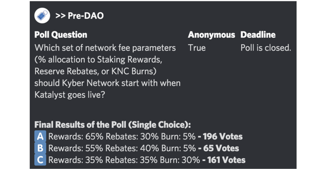 KyberDAO의 초기 파라미터 분배율을 설정하기 위한 사전조사에는 약 422명이 참여했는데, 옵션A가 가장 많은 투표를 받으며 보상 65% / 할인 30% / 토큰소각 5%으로 시작이 될 예정입니다.