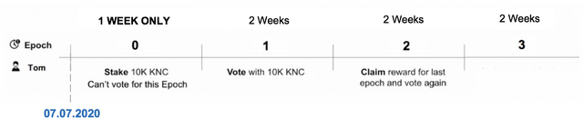 매주 Epoch별로 스테이킹 → 투표 → 보상수령의 단계가 나눠지는데, 예시를 들어 설명하면 다음과 같습니다.
