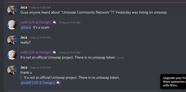 혹시라도 Uniswap을 통해서 토큰을 교환하려고 하시는 분들이 계시다면, 토큰 스왑 전에 해당 토큰의 컨트랙트, CMC나 Coingecko, 해당 프로젝트 공식 텔레그램/디스코드 채널 등을 통해 해당 토큰이 스캠인지 아닌지를 꼭 재차 검증해보시기 바랍니다.