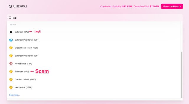 이러한 특징을 악용하여 유니스왑을 통해서 dYdX의 토큰으로 둔갑한 DYDX, 유니스왑의 토큰으로 둔갑한 UCN, 진짜 Balancer 토큰이 아닌 가짜 BAL토큰, BZRX 등등 다양한 스캠 토큰들이 공급되고 있고, 뭣도 모르고 사는 분들이 계속해서 늘어나고 있습니다.