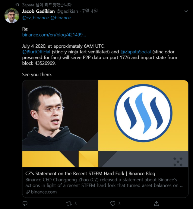 여기에 더불어 BLURT와 ZAPA의 포크 작업을 진행하고 있는 Jacob Gadikian의 경우에는 일전에 바이낸스의 CEO인 CZ가 별도의 포스팅을 통해 밝혔던 Go Fork Yourself를 언급하며 바이낸스에도 BLURT과 ZAPA를 상장해 줄 것을 우회적으로 어필하고 있는 중입니다.