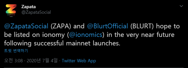 HIVE의 체인 스플릿 때에 가장 발 빠르게 상장을 진행하며 커뮤니티에 알려진 소형 거래소가 바로 ionomy와 probit이었습니다. 이번 BLURT와 ZAPA 역시 트위터를 통해 메인넷이 성공적으로 런칭되는 즉시 ionomy에 상장되길 바란다는 표현을 하고 있습니다.