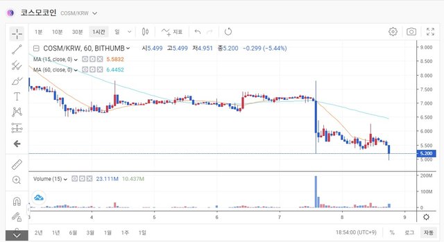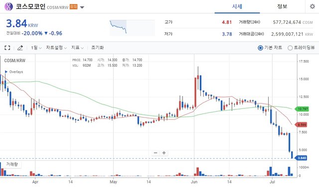 차트의 기술적 반등이나, 입금 중단으로 인한 거래소 자체의 가두리 효과, 추후 혹시나 모를 빗썸의 유의종목 해지 등을 기대로 하여 용감 무쌍하게 COSM 매입에 뛰어들고 있는 불나방들도 꽤나 많이 보이는데, 이는 정말 리스크가 매우 높은 행위라는 것을 꼭 아실 필요가 있습니다.