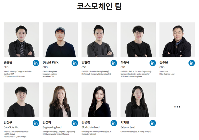 지금 현재 코스모체인의 팀원으로 확인되는 사람은 송호원 대표 1명 뿐이며, 대부분의 팀원들은 각자의 길로 떠난 것으로 확인됩니다.