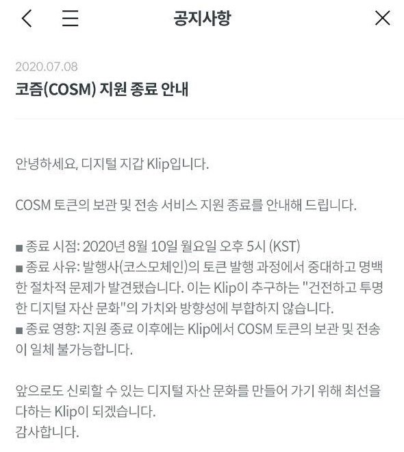 금일 카카오의 디지털 지갑 Klip에서 발행사(코스모체인)의 토큰 발행 과정에서 중대하고 명백한 절차적 문제가 발견됨에 따라 코즘(COSM) 토큰의 보관 및 전송 서비스 지원이 종료될 예정임이 공지되었습니다.