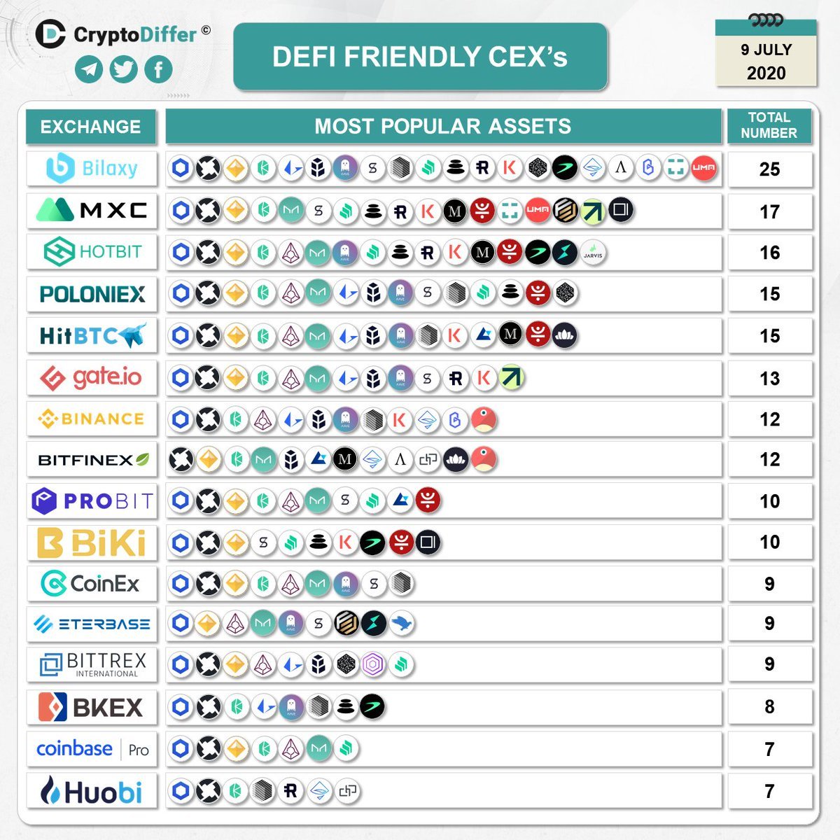 디지털자산(암호화폐)과 관련하여 트렌딩한 자료들을 시각적으로 잘 정리한 자료를 업로드해주는 CryptoDiffer의 중앙화된 거래소의 DeFi 프로젝트 토큰들의 상장 현황입니다. 한 때 무단상장하는 거래소로 유명해졌던 빌락시를 비롯하여 해외소형 거래소에 해당하는 MXC, HOTBIT 등의 순위가 제법 높은 것을 확인할 수 있습니다.