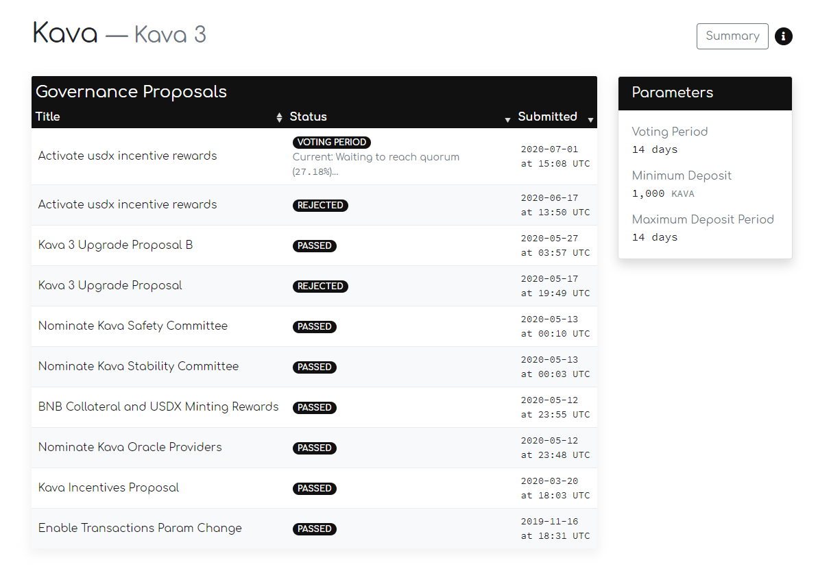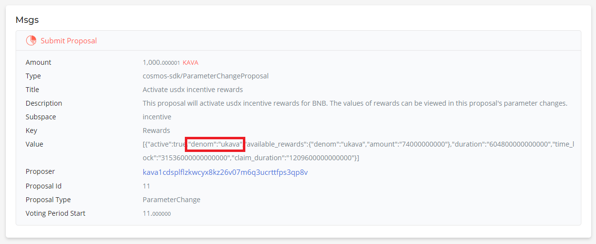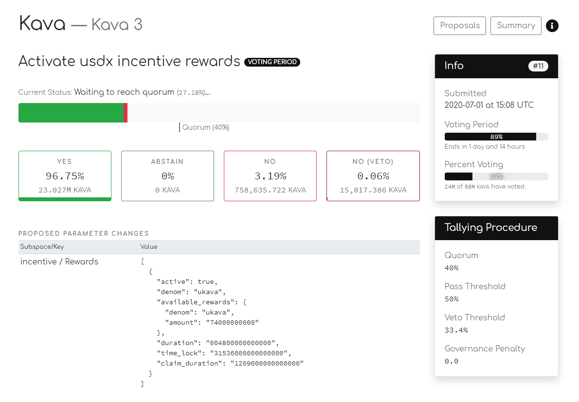 "Activate usdx incentive rewards"라는 이름으로 2020년 7월 1일에 제안된 Proposal #11은 Kava 플랫폼에서 BNB를 담보로 제공하고 USDX를 민트하는 사용자들에 대한 보상을 활성화하기 위해 제출되었으나, 해당 제안서에 포함된 Value값에 오류가 있는 관계로 해당 프로포절이 통과된다고 하더라도 제대로 보상이 활성화되지 못합니다.