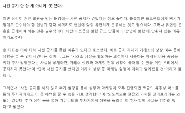 거래소 상장을 협의하는 과정에서 지출하는 마케팅 비용 충당을 위해 추가 발행했다는 사실을 공개하면, 거래소 상장과 마케팅 진행 상황이 틀어질 수 있을 거란 우려에서 공지하지 못했다고 밝혔는데, 이건 누가봐도 그냥 공지하지 않은 것입니다.