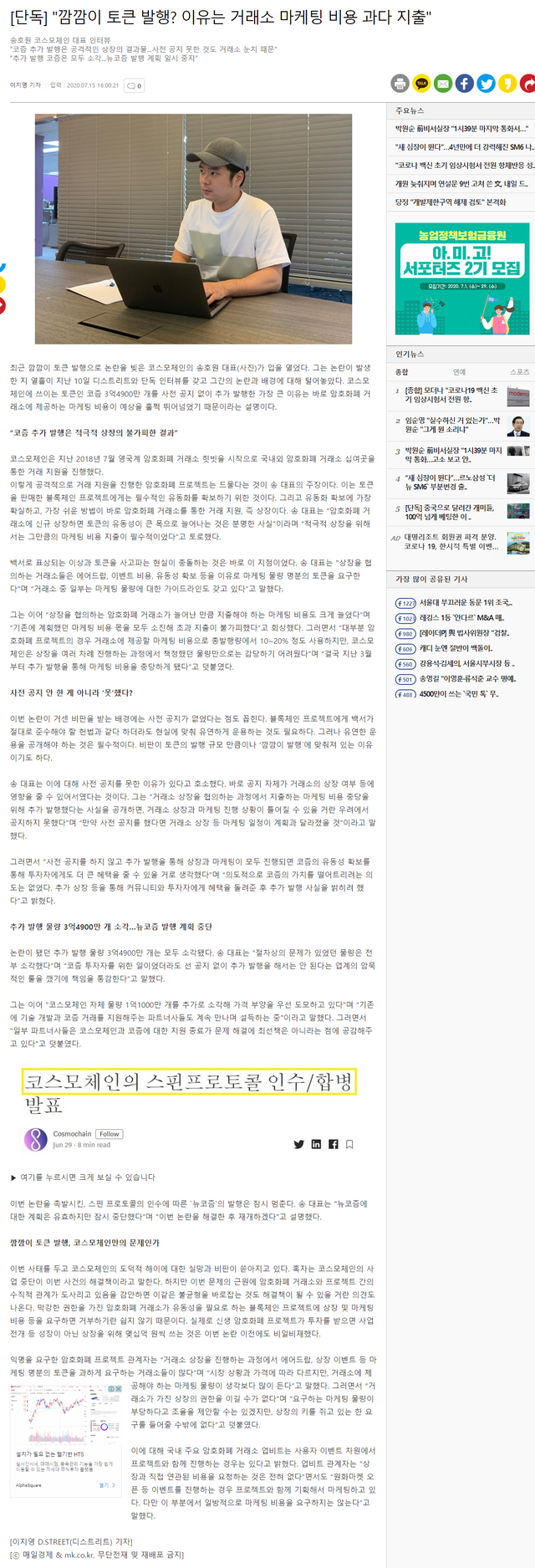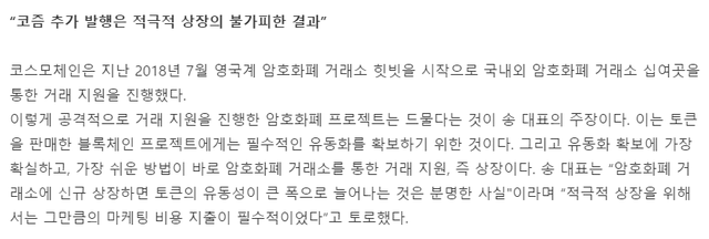 코스모체인의 송호원 대표는 해당 기사 인터뷰에서 "상장을 협의하는 암호화폐 거래소가 늘어난 만큼 지출해야 하는 마케팅 비용도 크게 늘었다. 기존에 계획했던 마케팅 비용 몫을 모두 소진해 초과 지출이 불가피했다."고 털어놓았습니다.