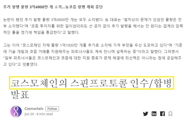 이더리움에서 클레이튼으로 전환 시 블록 익스플로러가 정상 작성하지 않는 것을 틈타서 토큰홀더들 몰래 4억 개 가량을 추가로 발행하며 논란에 휩싸였던 코스모체인의 입장 및 사실확인이 진행된 기사가 송출되었습니다.