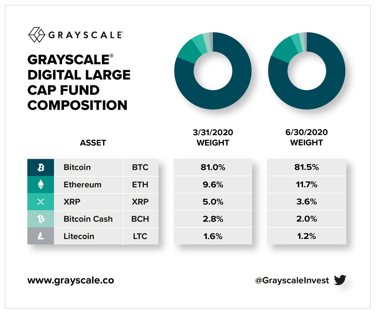 최근에 그레이스케일이 본인들의 공식 트위터를 통해 발표한 자료에 따르면 비트코인과 이더리움의 비중을 굉장히 공격적으로 늘려나가는 것을 지속하고 있는 반면에 비트코인캐시, 리플, 라이트코인의 비중은 조금 줄어든 모습입니다.