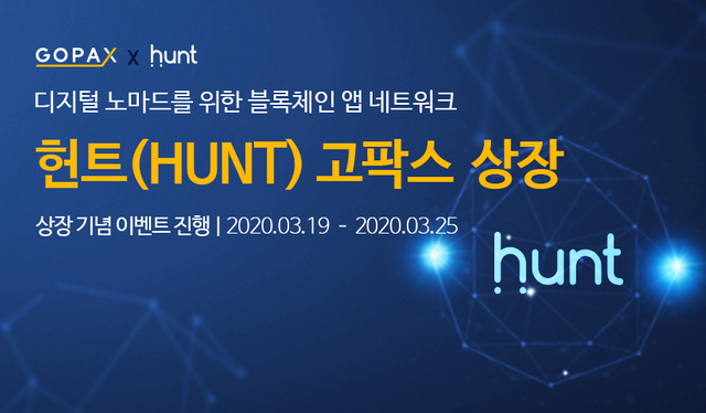 안녕하세요, 디온입니다. 전세계의 디지털 노마드와 앱 테크족들을 위한 차세대 블록체인 앱 네트워크 헌트(HUNT)가 내일(3월 19일, 목요일) 15:00에 고팍스 원화 마켓에 상장됩니다.