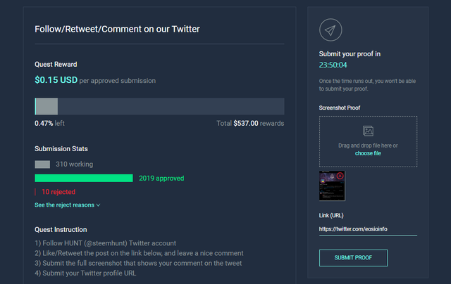 그 다음 퀘스트 요구사항에 맞춰 스크린샷을 첨부하고, 내 트윗 URL을 입력한 뒤에 Submit Proof 버튼을 클릭합니다.