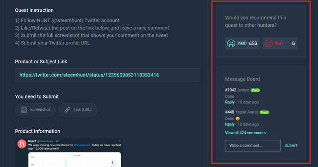 주목할만한 점은 최근에 리뷰헌트에서 정상적으로 퀘스트를 달성했음에도 불구하고 무단으로 거절(reject)을 하거나, 승인을 하지 않고 있는 사태가 종종 발생을 하면서, 유저들이 해당 퀘스트에 댓글을 달거나 추천/비추천을 할 수 있는 기능을 요청했었는데, 이것 또한 정말 빠르게 반영이 되었습니다. (리뷰 헌트 플랫폼을 계속 사용해야 하는 메이커라면 평판 관리도 중요할 것 같네요)
