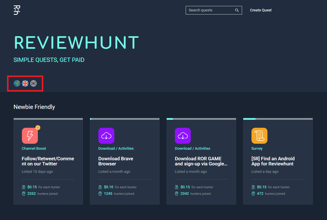 이 구분값은 기본적으로 헌터들이 참여가능한 퀘스트를 기본적으로 필터링하고 찾아보기 좋게 해줍니다. 예를 들어서, 한국 은행계좌를 등록해야 한다거나 한국인들만 가입이 가능한 퀘스트는 한국 국기 아이콘을 클릭했을 때만 나타나기 때문입니다.