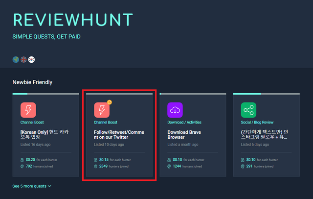 리뷰헌트에 접속하면 일단 위와 같이 수행가능한 퀘스트의 리스트가 나오는데, 기본적으로 퀘스트는 타겟 국가(언어)에 따라 구분이 됩니다.