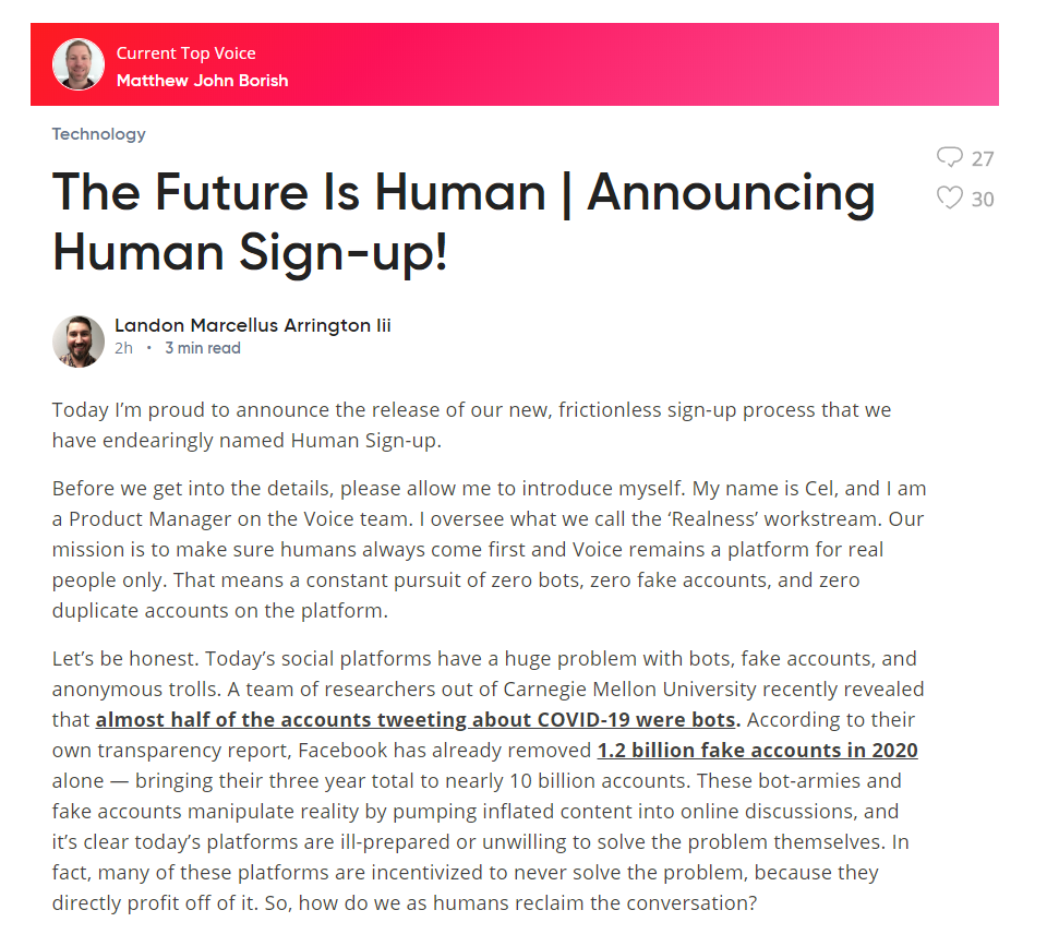 VOICE의 프로덕트 매니저인 Landon Marcellus Arrington이 자신의 보이스를 통해서 VOICE 회원가입시 해당 사용자가 봇이 아닌 실제로 살아 있는 사람인지를 구분하는 Human-Signup이 어떻게 작동하는지를 옅볼 수 있는 Sneak peek을 공개하였습니다.
