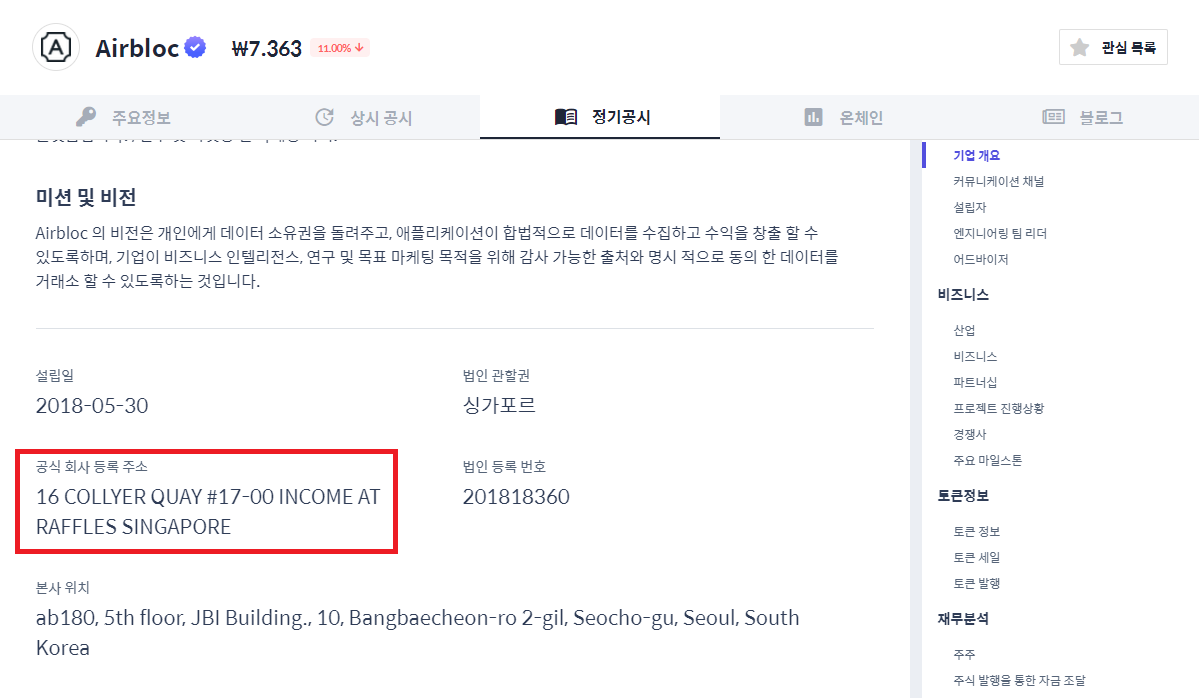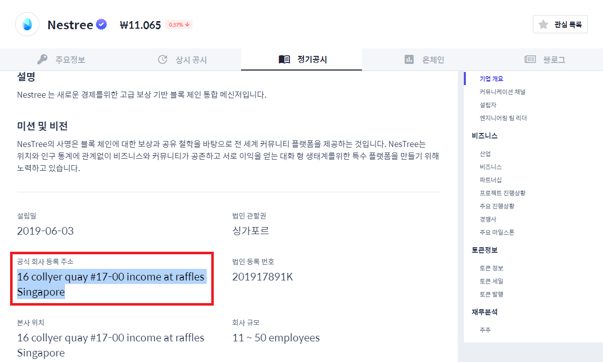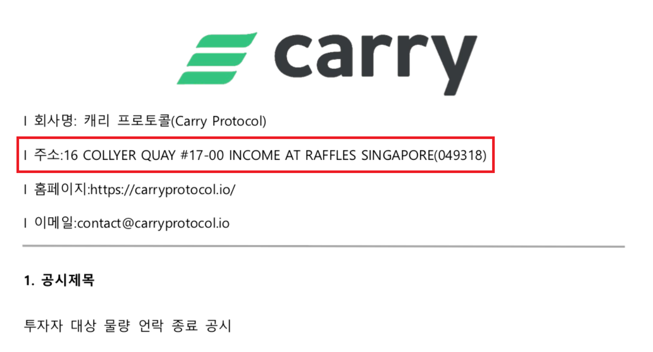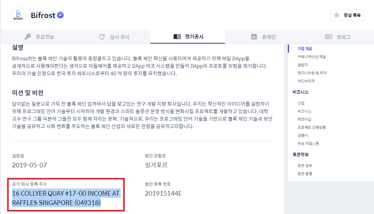 해당 회사의 주소지가 16 COLLYER QUAY #17-00 INCOME AT RAFFLES SINGAPORE 049318 인데, 국내에서 암호화폐 산업에 뛰어든 많은 스타트업들의 싱가포르 법인 사무소 주소지와 동일합니다.
