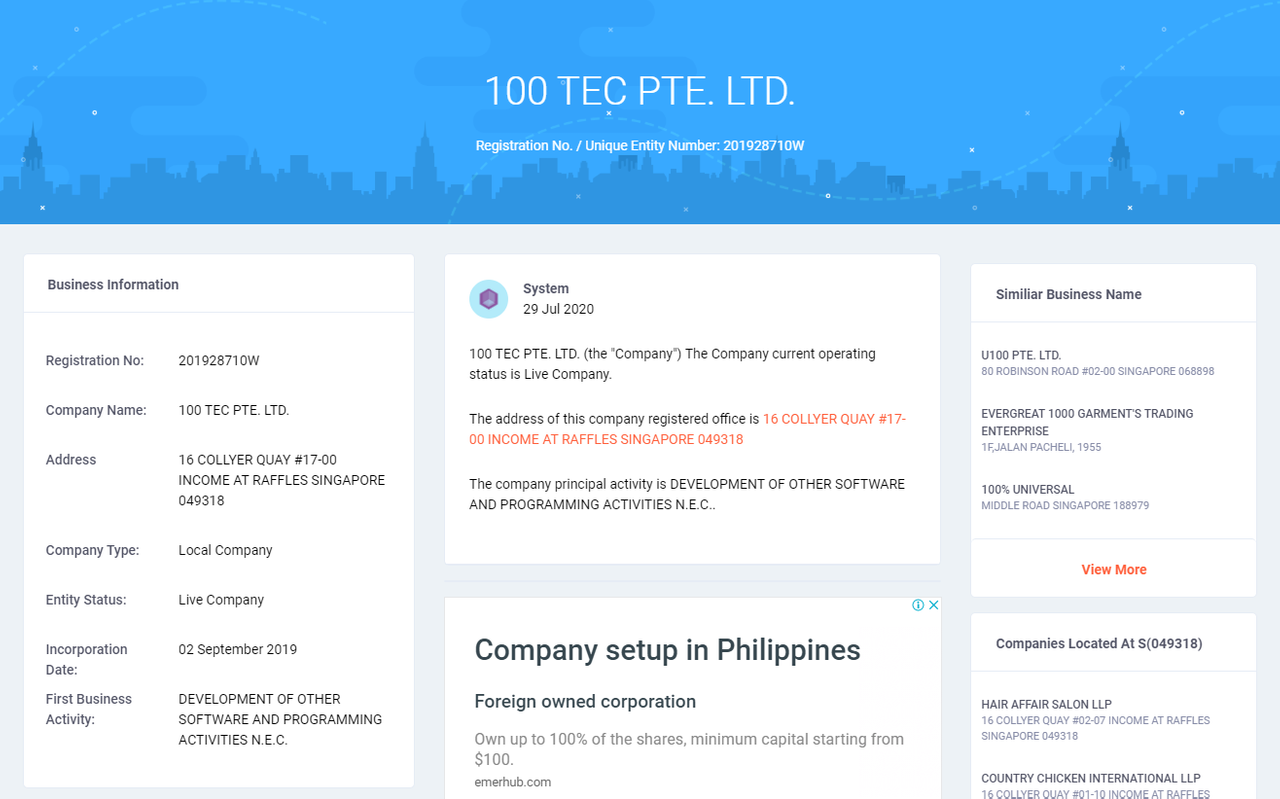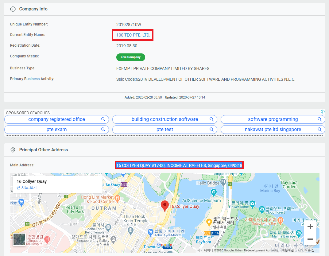 전세계 다수의 블록체인 산업에 투자하고 있는 투자법인이라는 100 TEC PTE.LTD는 "DEVELOPMENT OF OTHER SOFTWARE AND PROGRAMMING ACTIVITIES N.E.C"을 주요 비즈니스 회사로 검색이 되는데, 요건 다른 크립토 프로젝트들도 동일하게 사용하고 있는 업종 분류인 것으로 보이고, 여기서 재미있는 점은 해당 회사의 싱가포르 주소 소재지입니다.