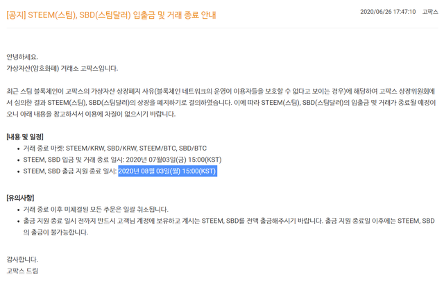 약 한 달 전쯤에 공지가 되었던 것처럼 고팍스에서 STEEM과 SBD의 입출금이 8월 3일(월) 15:00까지만 지원됩니다. 혹시라도 현재 고팍스에서 스팀과 스팀달러를 보관하고 계시는 분들은 8월 3일 15시 전까지는 개인 계정 또는 타 거래소로 출금을 진행하셔야 합니다.