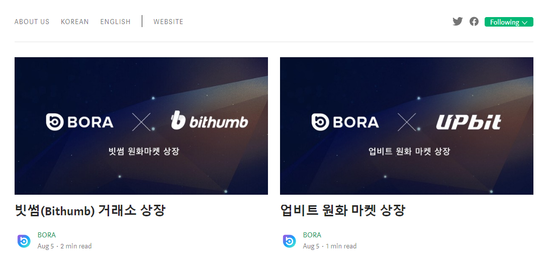 BORA 공식 미디엄에 빗썸 상장 소식은 공지와 동시에 거의 곧바로 업로드 되었으나, 업비트는 상장이 완료된 이후 긴급히 급조되어 올라왔다고 볼 수 밖에 없는 상황이었네요. 사실 프로젝트팀의 입장에서도 빗썸 원화마켓 상장과 업비트 원화마켓 상장이라는 가장 큰 호재 소재를 동시다발적으로 터뜨릴 이유도 없으며, 그걸 원하지도 않았을 겁니다.