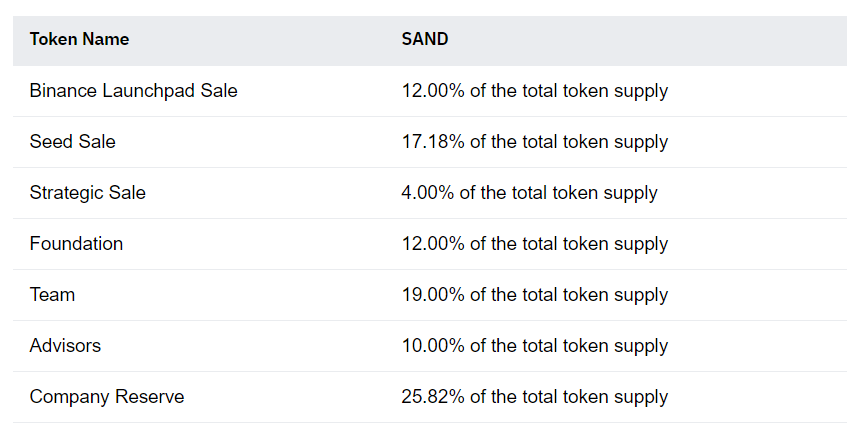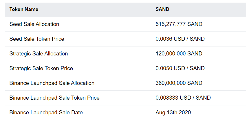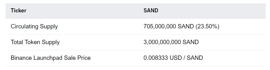 이번 바이낸스 런치패드에 할당된 물량은 전체 공급량의 12%에 해당하는 360,000,000 SAND이며, 판매가격은 0.008333달러로 책정되었습니다. (별도의 vesting조건이 없는 런치패드의 판매가격으로는 제법 괜찮은 딜이 아닌가 싶습니다)