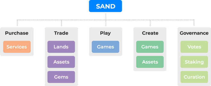 (1) 샌드박스 플랫폼에서 사용 : 게임 플레이어들은 장비 구매, 캐릭터 아바타 커스터마이징 등에 SAND를 사용하게 되며, 크리에이터들은 애셋, 랜드 등을 획득하기 위해 SAND를 사용하게 됩니다. 더불어 NFT인 LAND를 구매하기 위해서도 SAND를 사용해야만 하고, 마켓에 자신이 만든 애셋들을 리스팅하고자 하는 아티스트들도 SAND가 필요합니다.