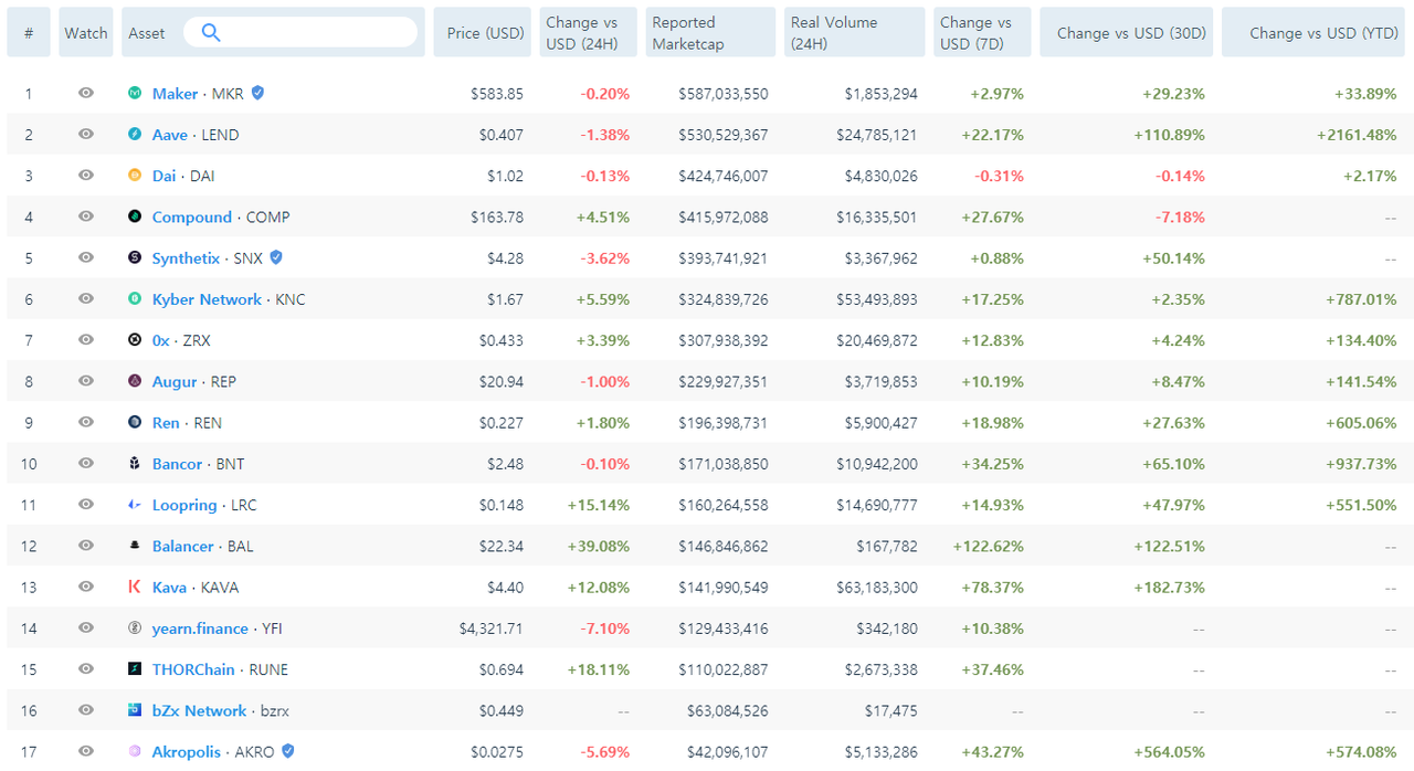현재 디파이 프로젝트들의 시가총액 순위는 잠깐의 버블이라고 넘어가기에는 꽤나 묵직한 순위까지 올라와 버린 상황이고, 비트코인과 이더리움을 필두로 한 메이저들의 본격적인 반격이 시작되기 전까지는 DeFi 프로젝트들의 강세장이 쉽게 끝나지만은 않을 것 같은 분위기인듯 싶습니다.