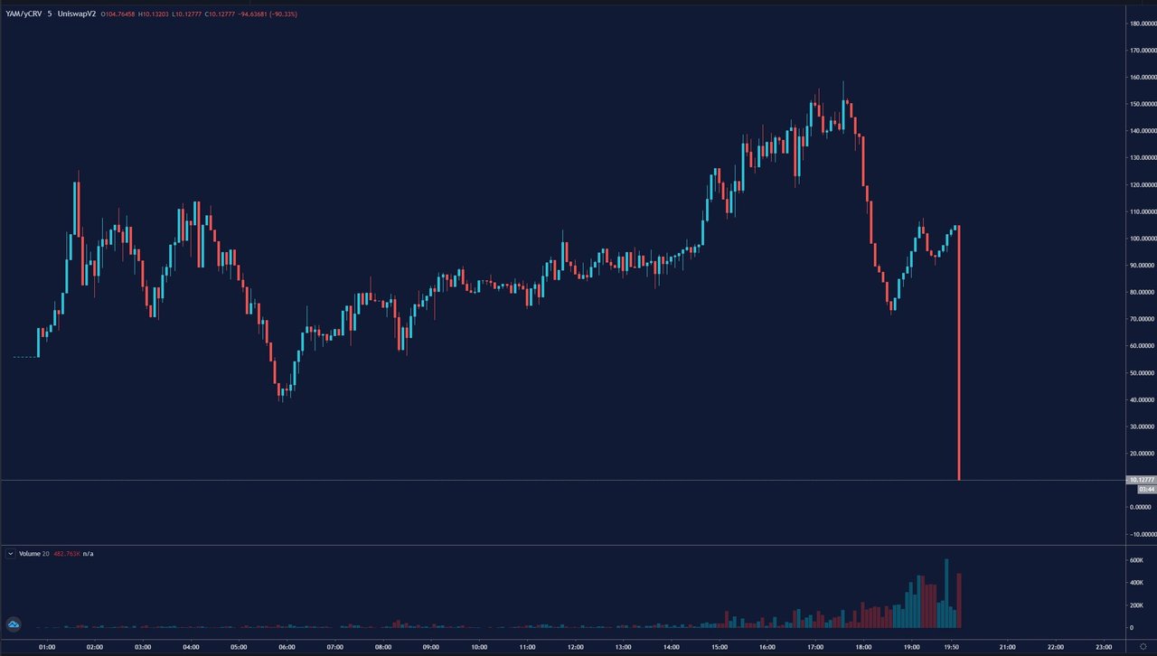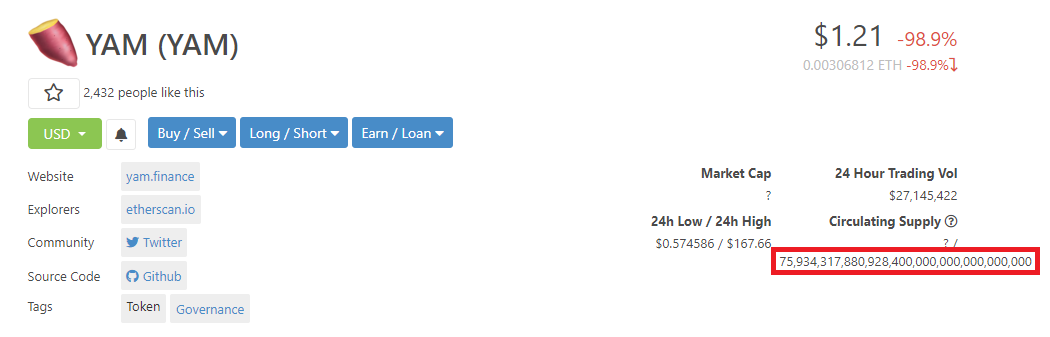 가격 상승으로 인한 유통량 증가(액면분할)이 필요할 때를 위해 마련되어 있는 인플레이션용 풀의 수량도 함께 증가하는 버그가 발생하면서, 결국 공급량만 말도 안되는 수준으로 펌핑되었던 YAM은 belmore의 실패선언과 함께 167달러에서 1달러까지 일순간에 추락해버렸습니다.